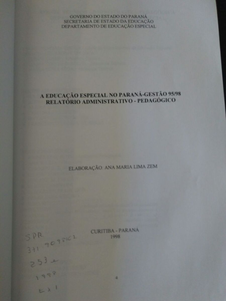Título: A educação especial no Paraná: gestão 95/98: relatório administrativo-pedagógico