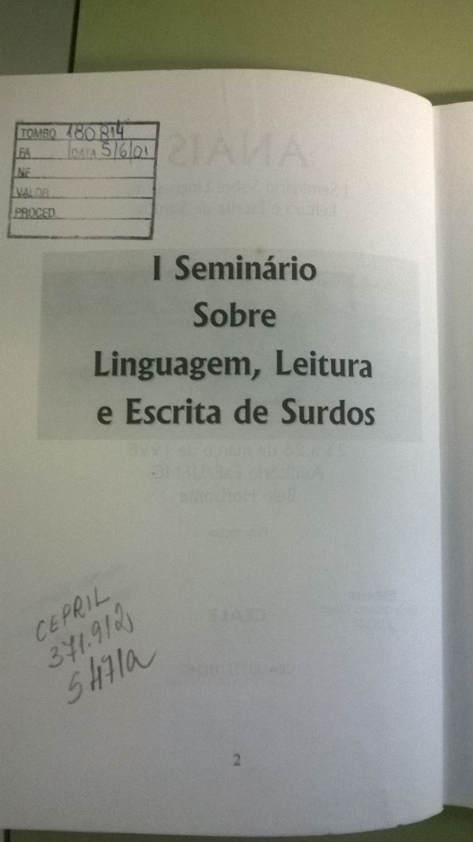 Título: Anais I Seminário sobre linguagem, leitura e escrita de surdos