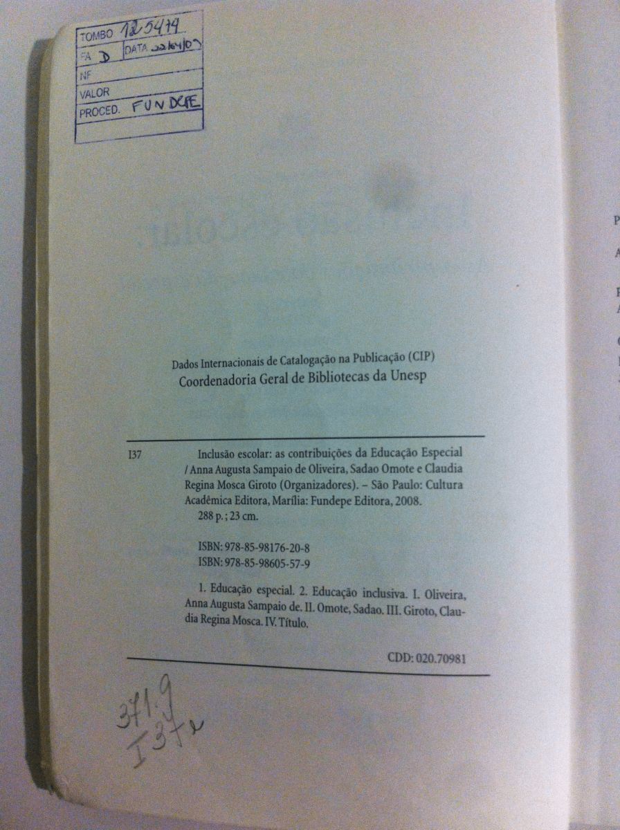 Autor/Organizador: orgs. Anna Augusta Sampaio de Oliveira/, Sadao Omote/, Claudia Regina Mosca Giroto