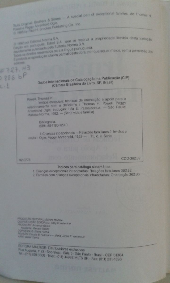 Título: Irmãos especiais: técnicas de orientação e apoio para o relacionamento com o deficiente