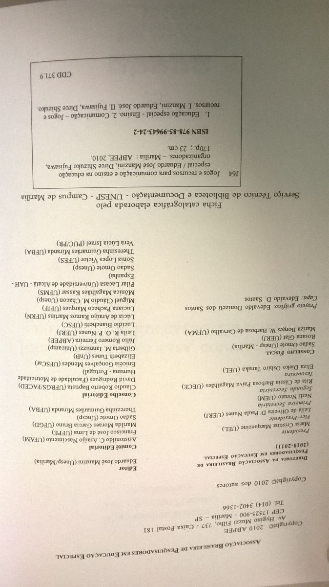Autor/Organizador: Eduardo José Manzini; Dirce Shizuko Fujisawa