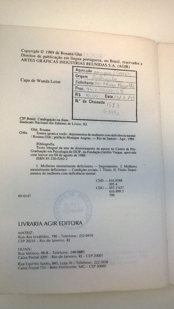 Título: Somos iguais a vocês: depoimentos de mulheres com deficiência mental